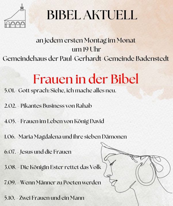 an jedem ersten Montag um 19 Uhr im GemeindehausThema: Frauen in der Bibel