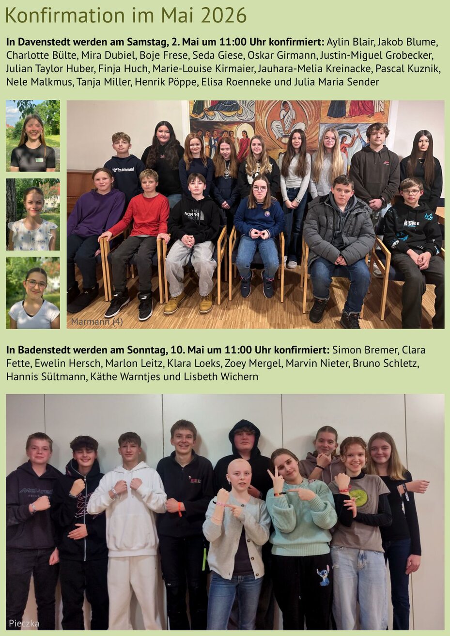 Am 10.05.2026 feiern wir unsere Konfirmation. Damit gelten wir als vollwertige Mitglieder der Kirchengemeinde. Ich freue mich schon sehr darauf, wenn wir uns Euch/Ihnen vorstellen und unser Erlerntes zeigen dürfen.