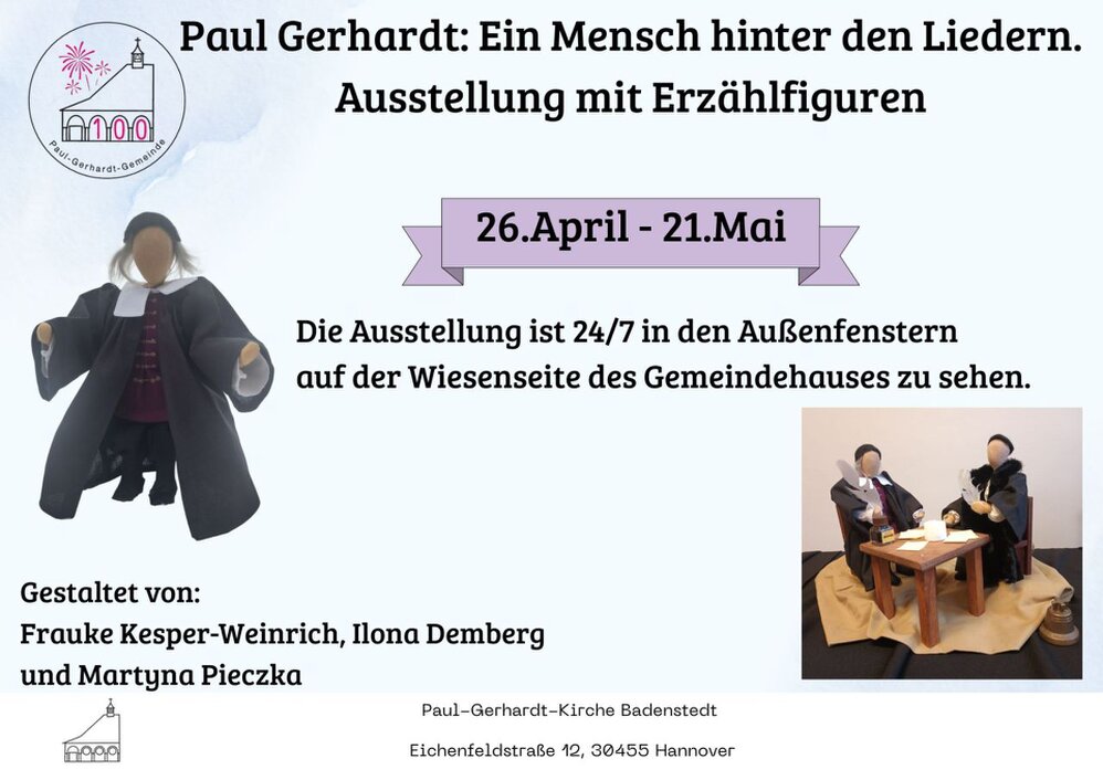 03.April (Karfreitag), 15 Uhr - O Haupt voll Blut und Wunden26.April, 10 Uhr - Geh aus, mein Herz - Vorstellungsgottesdienstder Konfis undEröffnung der Ausstellung mit Erzählfiguren“Paul Gerhardt: Der Mensch hinter den Liedern”03.Mai 10 Uhr - Ich singe dir mit Herz und Mund07.Juni, 10 Uhr - Du meine Seele, singe02.August, 10 Uhr - Die güldne Sonne27.September, 10 Uhr - Nun ruhen alle Wälder22.November, 10 Uhr - Ich bin ein Gast auf Erden13.Dezember, 10 Uhr - Wie soll ich dich empfangen24.Dezember, 17 Uhr - Ich steh an deiner Krippen hier